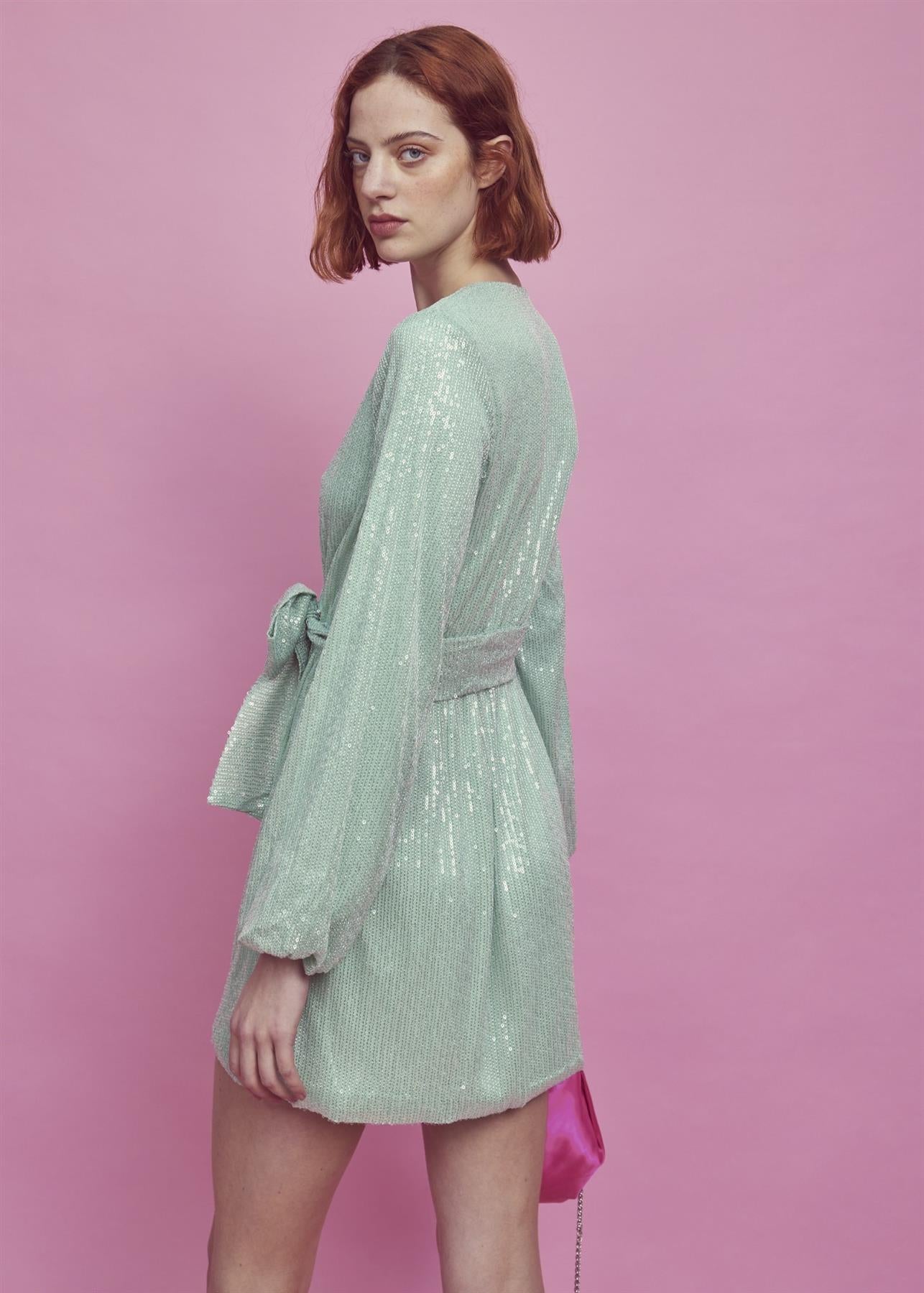 Collective the Label Women's Alice Tie-Waist Sequin Mini-Dress -Apple-Green Sequin. Designed to bring out your confident side, this piece is perfect for capturing attention and showing off your curves. Featuring a fixed wrap design with sequin fabric for a dazzling finish, long puff sleeves, and waist tie detail for a flattering silhouette, this dress is sure to ensure you make an entrance at any event.