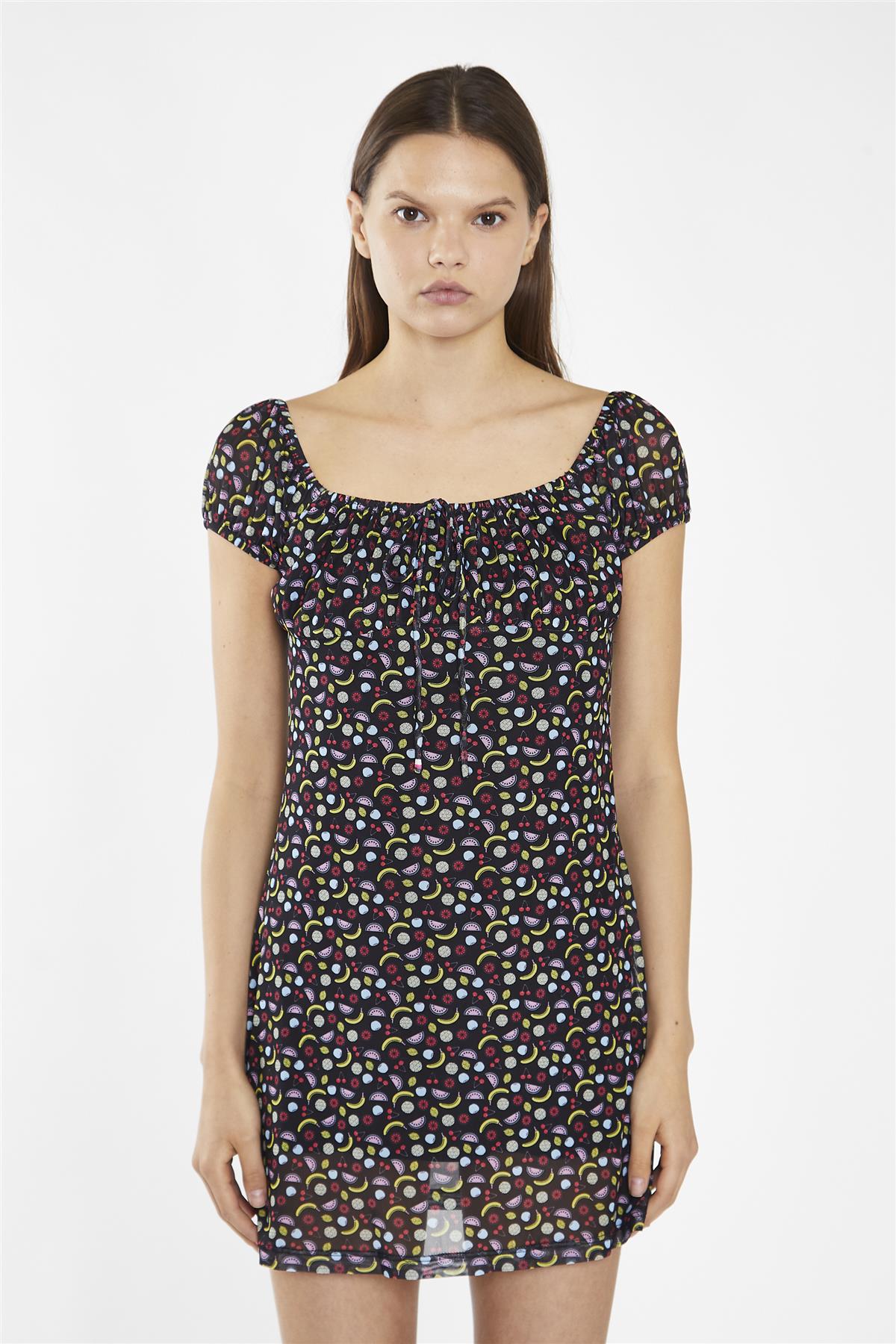 Glamorous Women's Black Fruit-Print Mesh Milkmaid Mini-Dress. Add some playful charm to your wardrobe with this Black Fruit-Print Mini-Dress! Featuring a gathered milkmaid style bodice and cap sleeves, this dress offers a flattering A-line skirt and mini length for a fun and flirty look. It's the perfect outfit for any occasion!
