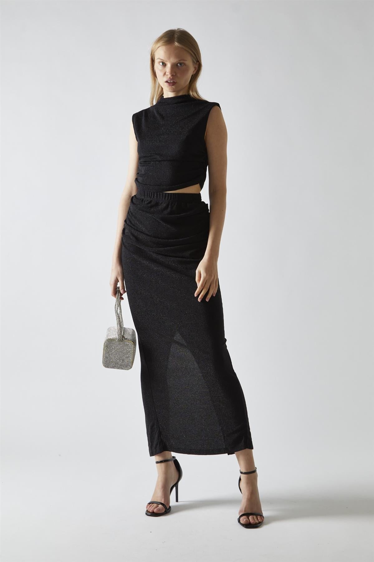 Glamorous Women's Black-Glitter Ruched Midaxi-Skirt. Shine bright in this stunning black-glitter ruched midaxi skirt, designed to make you feel fabulous on any occasion. The eye-catching glitter fabric adds a touch of glamour, perfect for parties or special events. With a bodycon fit, this skirt hugs your curves beautifully, while the ruched seams provide a flattering silhouette that enhances your figure. The center back split not only adds a playful touch but also allows for easy movement, making it comfortable to wear throughout the day or night. Pair it with the matching top for a chic, coordinated look that’s sure to turn heads, or style it with a simple fitted tee for a more casual vibe. This versatile midaxi skirt is a must-have addition to your wardrobe, ensuring you’ll always have a stylish option ready for any event. With this piece, you’ll feel confident and ready to shine!.