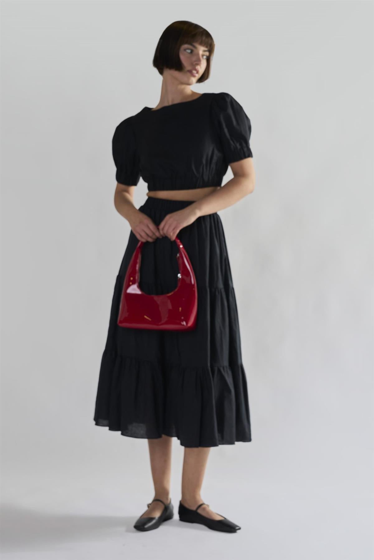 Glamorous Women's Black Puffed-Sleeve Crop-Top. This black puffed-sleeve crop top brings a fun, easygoing vibe to your outfit, with an elasticated waistband that gently hugs your shape without feeling tight or restrictive. The round neckline keeps things simple and relaxed, while the puff sleeves add just the right touch of playful volume, giving the top a little extra charm. For a soft, coordinated look, pair it with our matching black tiered midi skirt — the flowy layers balance beautifully with the cropped cut, creating an outfit that feels both effortless and put-together. Add a pair of sandals or sneakers, and you’re set for anything from coffee runs to casual dinners with friends.