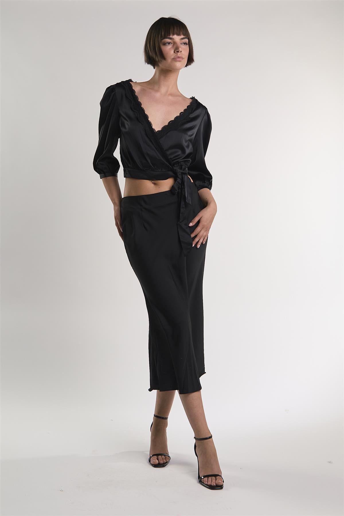 Glamorous Women's Black Satin-Crossover-Tie Crop-Top. This black satin-crossover-tie crop-top combines smooth fabric with delicate details to create a look that's both easygoing and stylish. The V-neck shape offers a flattering frame, while the lace trim adds a soft touch that balances the sheen of the satin. Long balloon sleeves bring a relaxed and airy feel, giving the top a bit of drama without being overwhelming. The tie-front design lets you adjust the fit to your liking, adding a playful twist to the silhouette. Pair it with jeans or a simple skirt for a look that feels casually put together and ready for anything from brunch to evening hangouts.