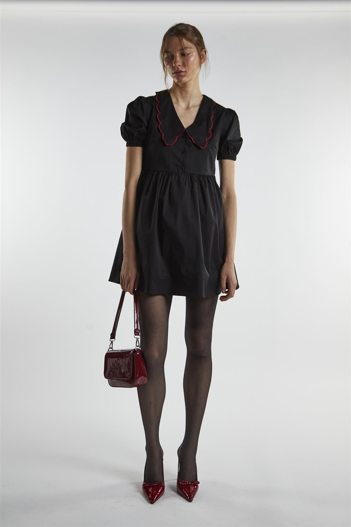 Glamorous Women's Black Scalloped-Collar Mini-Dress. This charming black mini-dress is a playful twist on classic style. The standout scalloped collar, adorned with eye-catching contrast stitching, adds a touch of whimsy to your look. A row of buttons down the front gives you the option to adjust your neckline, while the puff sleeves bring a dash of romance. The skater silhouette creates a flattering shape that's both comfortable and stylish. With its mini length, this dress is perfect for showing off your favourite shoes or boots. It's a versatile piece that can easily transition from day to night, making it a go-to choice for various occasions. The timeless black colour ensures this dress will remain a staple in your wardrobe for seasons to come. Pair it with colourful accessories to make the contrast stitching pop, or keep it sleek with minimalist jewellery for a more understated look.