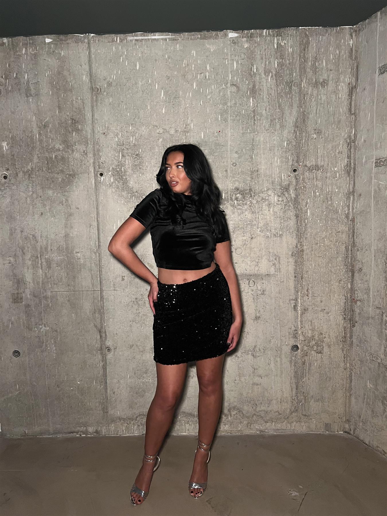 Glamorous Women's Black-Sequin Velvet Mini Skirt. Add some sparkle to your wardrobe with this Black Sequin Mini Skirt. Its high-waisted fit flatters your figure, sitting comfortably at the waist while accentuating your curves. The mini length gives it a fun, flirty edge, making it perfect for a night out or any occasion where you want to stand out. Covered in shimmering sequins, this skirt catches the light beautifully, giving you that extra bit of shine without feeling overdone. Pair it with a simple top and heels for a chic evening look or tone it down with a cozy knit for a more laid-back vibe. A go-to piece when you want to add a touch of glam.