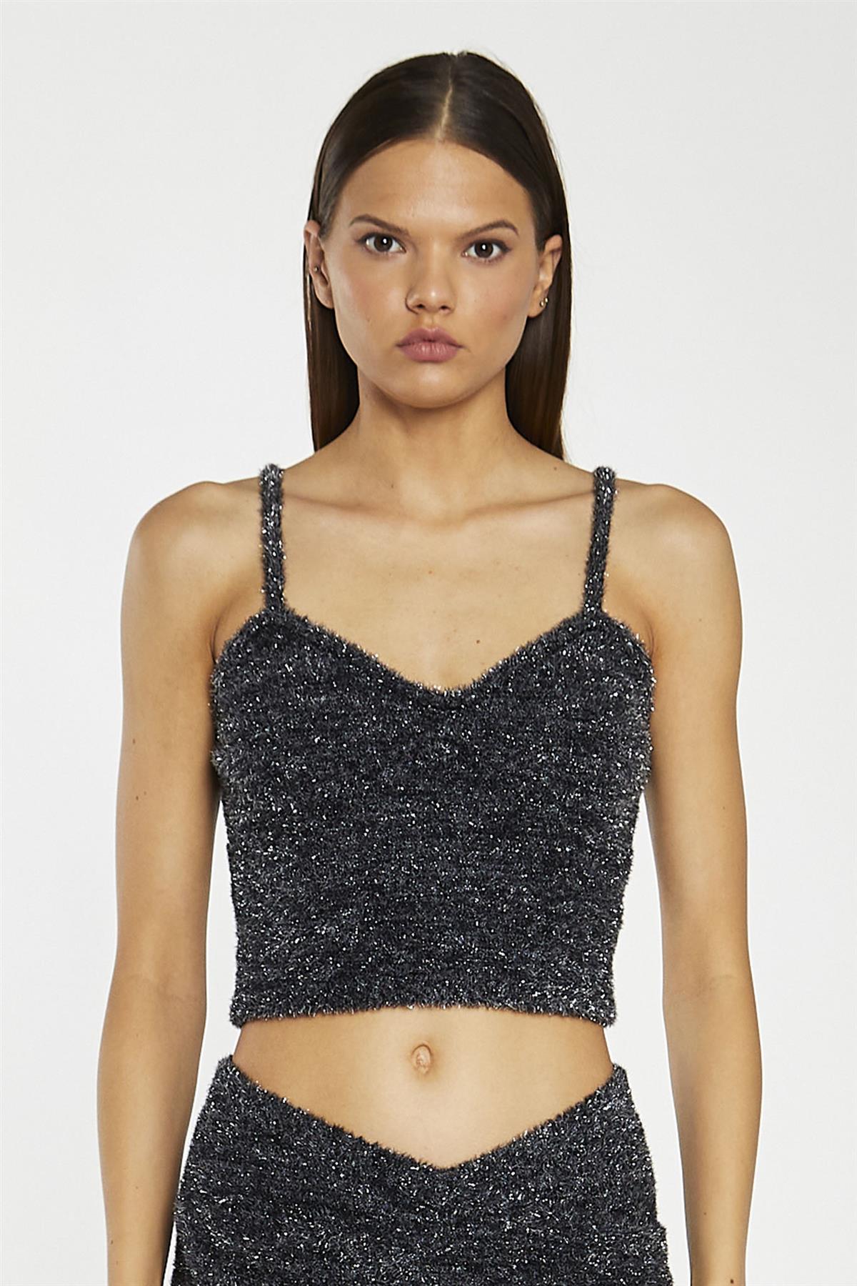 Black-Silver Tinsel Knitted Cami Crop-Top