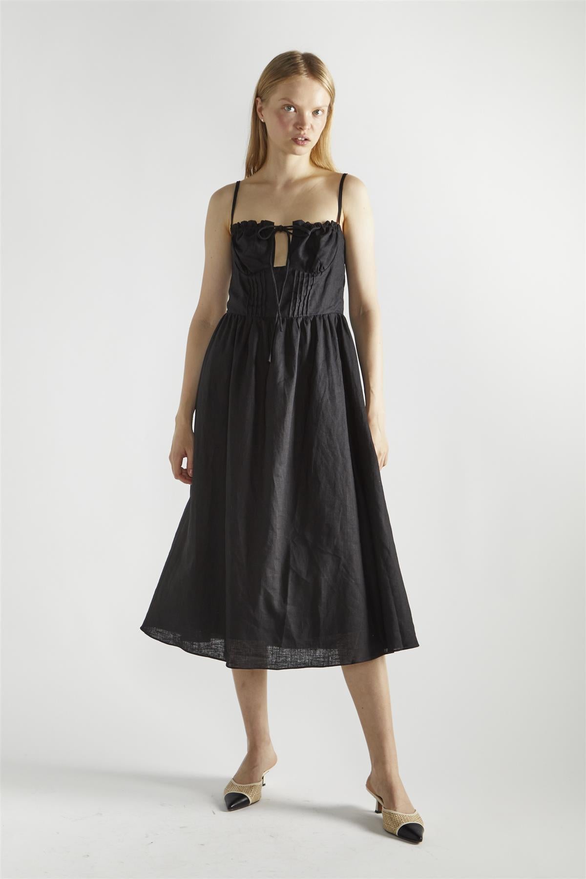 Glamorous Women's Black Tie-Front Midi-Dresses. Hey there, style seeker! Let's chat about this fabulous tie-front midi dress that's about to become your new go-to for any occasion. The tie-front detail adds a playful touch, allowing you to customize your look and accentuate your waist just the way you like it. Those adjustable spaghetti straps are a game-changer - they let you find your ideal fit, ensuring comfort all day long. And can we talk about that sneaky concealed zip fastening at the side? It's like a secret agent, keeping your look sleek while making it a breeze to slip in and out of this beauty. This dress is like a fashion chameleon - pair it with some cute flats and a denim jacket for a casual day out, or glam it up with some strappy heels and statement jewellery for a night on the town. The midi length is that sweet spot between flirty and sophisticated, making it versatile for so many events. The fabric feels like a dream against your skin, so you'll be comfy from dawn to dusk (and beyond). Trust us, this tie-front wonder is going to have you feeling confident and fabulous every time you put it on!