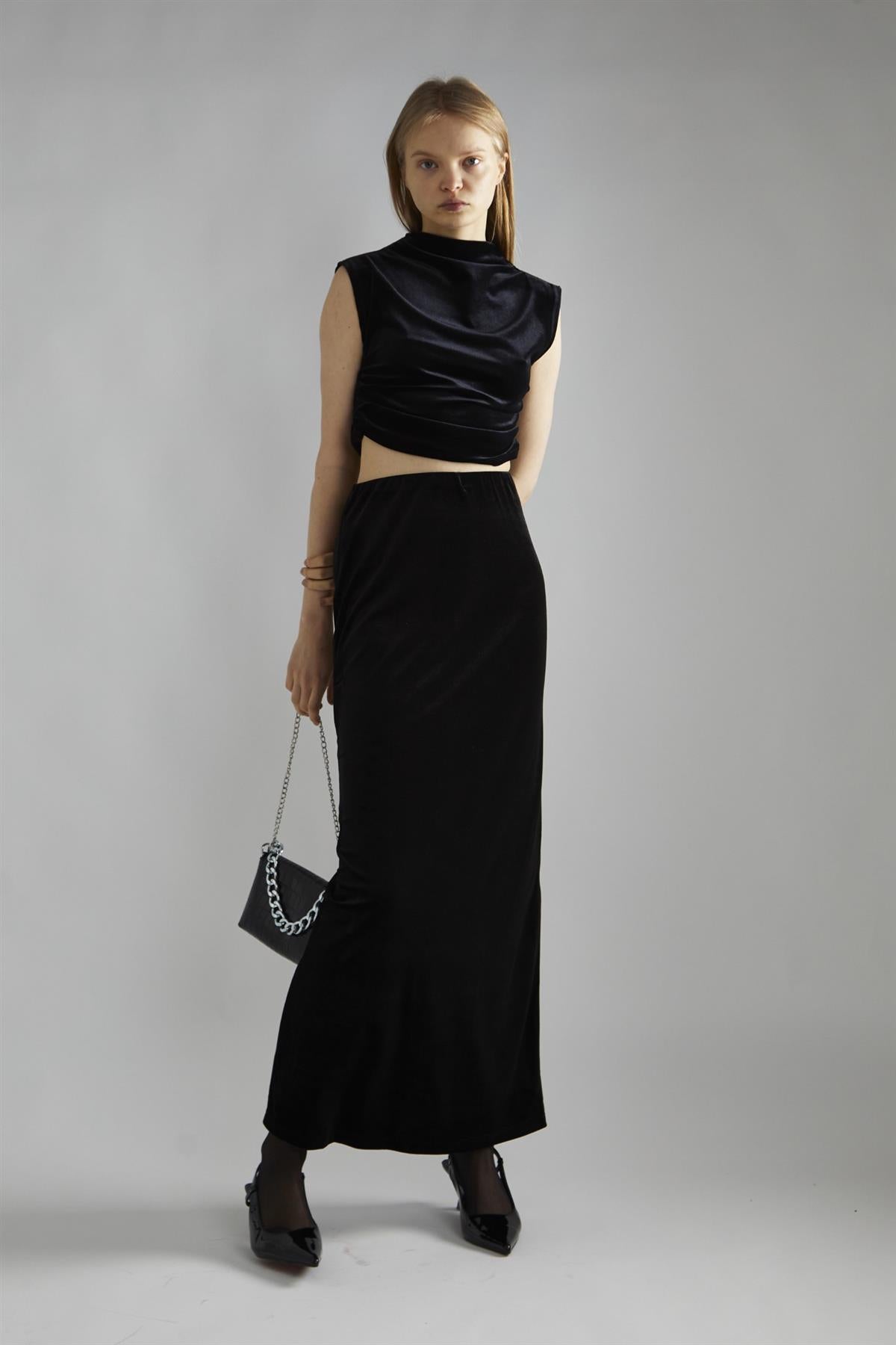 Glamorous Studio Women’s Black-Velvet Ruched Crop-Top. Add a touch of elegance to your wardrobe with this black velvet ruched fitted crop top. The luxurious velvet fabric feels soft against the skin, while the ruched details create a flattering and textured look. This crop style top is perfect for showing off your waist and pairing with high-waisted bottoms. It’s versatile enough to dress up or down, making it a great choice for various occasions. For a coordinated look, pair it with the matching skirt, or mix and match with your favourite jeans or trousers for a more casual vibe. The fitted design ensures a sleek silhouette, while the rich black colour makes it easy to accessorize with bold jewellery or a statement bag. This crop top is a stylish addition to any outfit, offering endless possibilities for creating your unique look..
