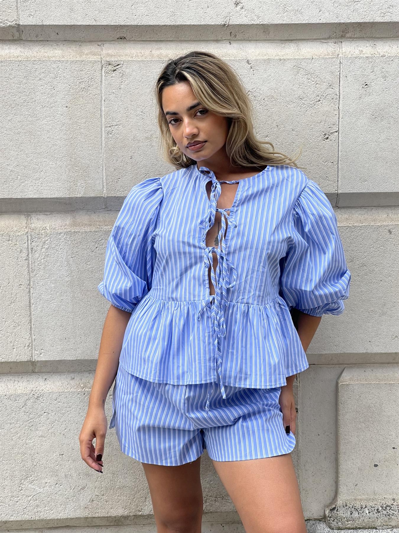 Glamorous Women's Blue-Stripe Tie-Front Peplum Top. Introducing the perfect summer staple: our Blue-Stripe Tie-Front Peplum Top! With its matching shorts, tie front design, gathered peplum detail, and loose oversized fit, this top is both stylish and comfortable. The puff sleeves add a playful touch to this must-have piece. Don't miss out!