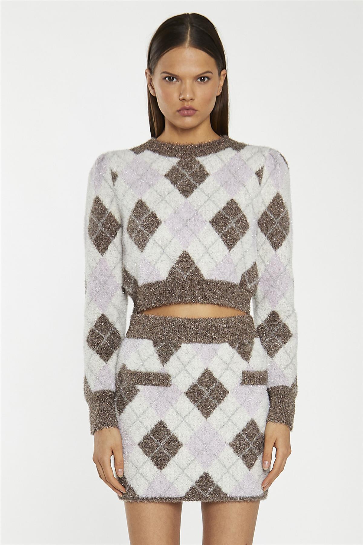 Glamorous Women's Brown Multi-Argyle Glitter Knit Mini-Skirt. This Glitter Knit Mini-Skirt is the perfect way to make a statement! It features a glitter knit, mini length, elasticated waistband, and mock pocket detail. This flirty number pairs perfectly with its matching jumper and is sure to have all eyes on you day and night!