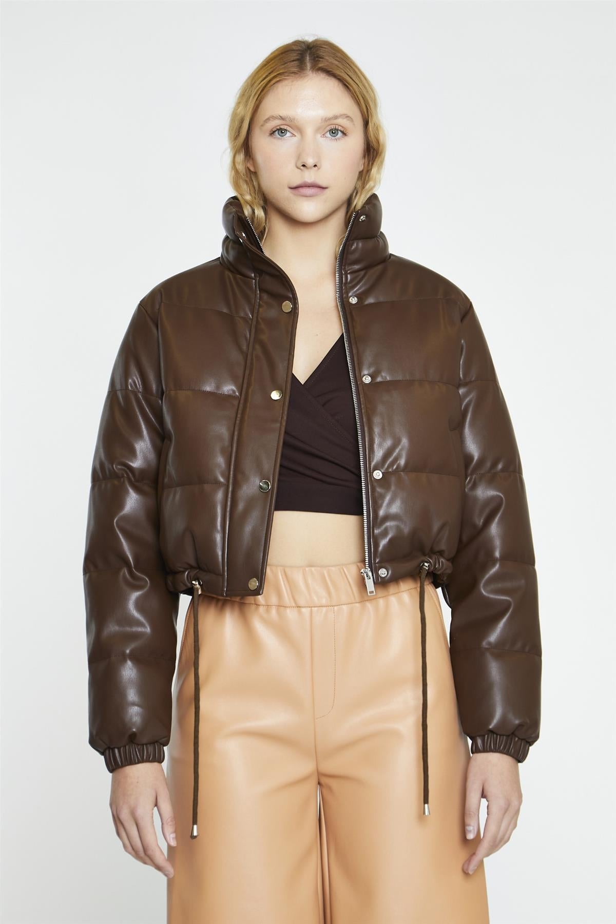 Brown PU Puffer Cropped-Jacket