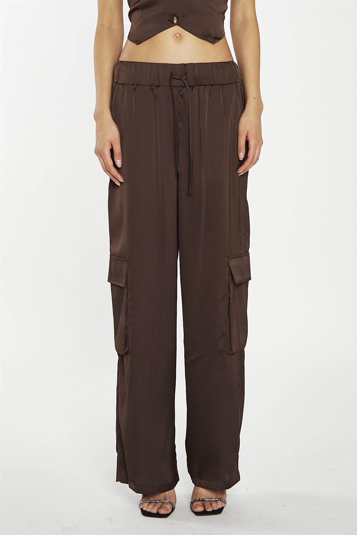 Glamorous Women's Brown-Satin Cargo Trousers. Stay chic and comfortable in these Cargo Trousers! Featuring classic cargo pocket details and drawstring waistband for a custom fit. Style with the matching top, for a chic look from head-to-toe!