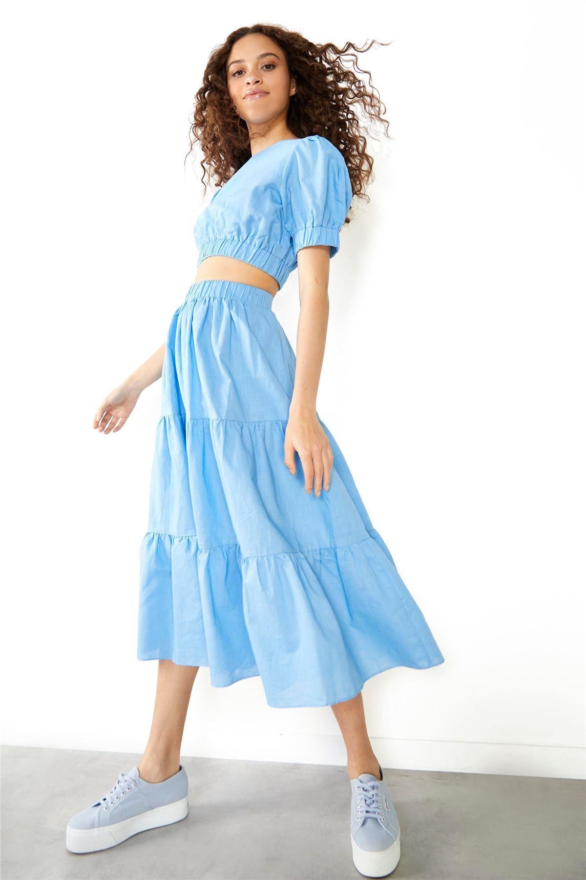 Glamorous Women's Cornflower-Blue Tiered Midi-Skirt. Introducing the Cornflower-Blue Tiered Midi-Skirt - a delightful addition to your wardrobe! This skirt features a flattering elasticated waistband, allowing for a comfortable and customizable fit. The tiered layers add a touch of playfulness, creating a stylish and feminine silhouette. With a midi length, it's the perfect balance between coverage and flair. Pair it with a simple tee and sandals for a laid-back, summer-inspired look, or dress it up with a blouse and heels for a more polished vibe. Embrace the beauty of this versatile skirt and let it elevate your everyday style with ease.