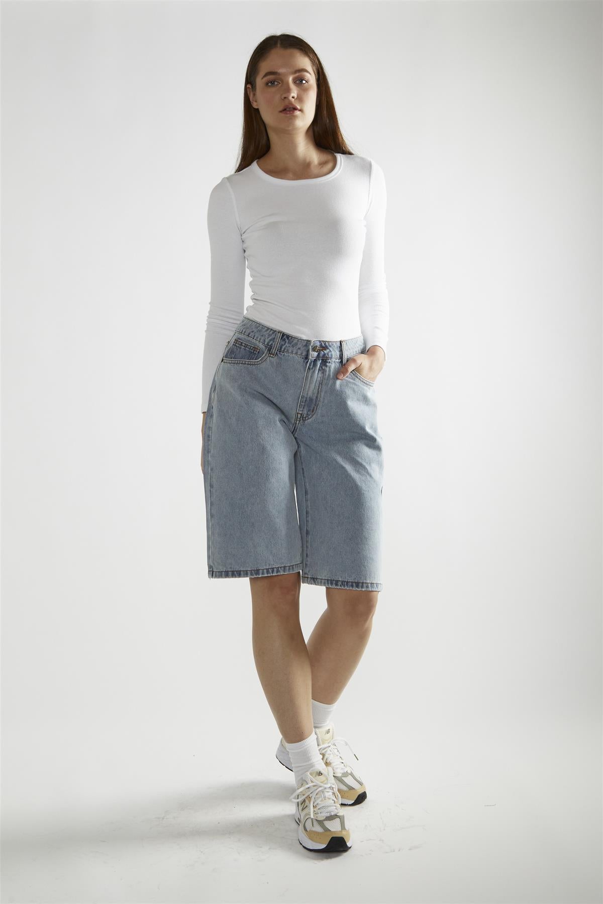 Glamorous Women's Dirty Vintage Blue Denim Long -Shorts . Our Dirty Vintage Blue Denim Long Shorts are the perfect blend of rugged charm and casual comfort. These shorts feature a lived-in look with their unique dirty vintage wash, giving them character right from the start. The longer length hits just above the knee, offering extra coverage while keeping you cool on warmer days. Made from sturdy denim, they're built to last and will only get better with wear. These shorts are ideal for your laid-back adventures, from backyard barbecues to weekend flea market trips. They pair effortlessly with graphic tees, tank tops, or even a button-down shirt for a slightly dressier vibe. The versatile dirty vintage blue colour works well with a variety of tops and shoes, making outfit planning a breeze. With their relaxed fit and timeless style, these long shorts are sure to become a staple in your casual wardrobe, offering both comfort and a touch of vintage cool to your everyday looks.