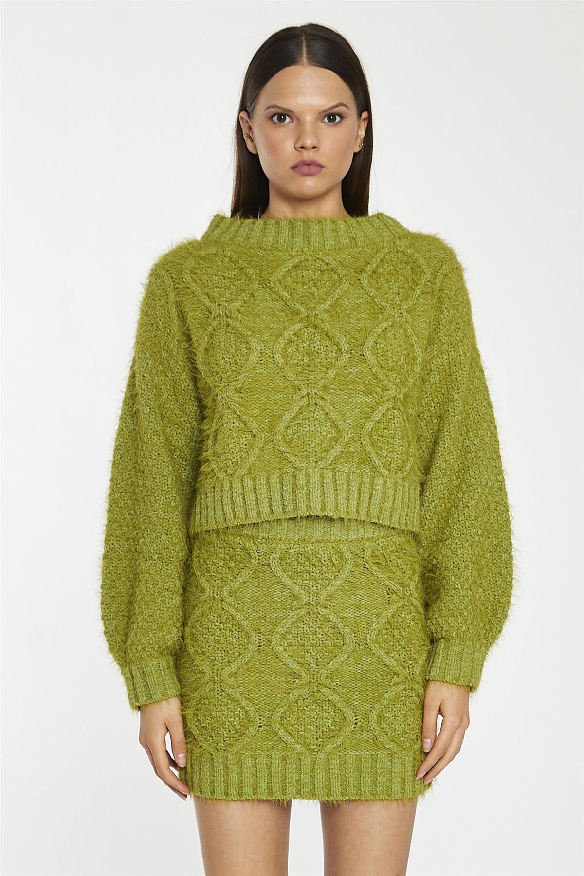 Glamorous Women's Grass-Green Cable-Knit Long Sleeve Jumper. Stay warm and stylish in this Cable-Knit Long Sleeve Jumper. With its matching skirt, cable knit design, classic crew neck jumper silhouette, and fluffy knit fabric, this jumper is sure to become your go-to look for chilly days!