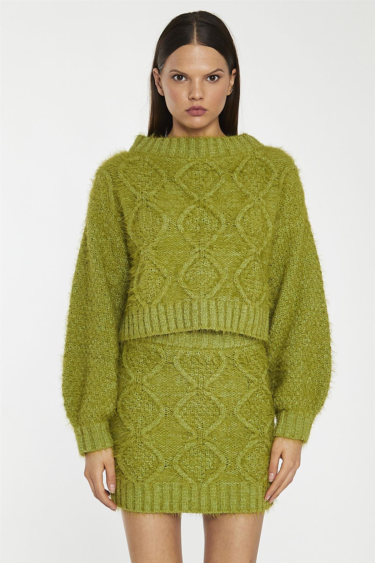Glamorous Women's Grass-Green Cable-Knit Mini-Skirt. This gorgeous mini-skirt is perfect for creating a cozy look. Featuring a cable-knit design, elasticated waistband, and fluffy knit, it has a matching jumper for a complete look. Enjoy a cozy look with this mini-skirt set.