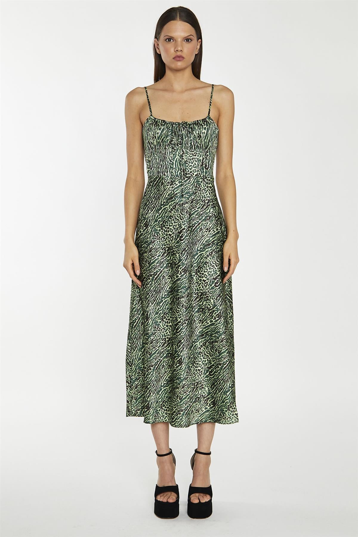 Glamorous Women's Green-Black Animal Strappy Milkmaid Midi-Dress. Look stunning in our Strappy Milkmaid Midi-Dress! This playful dress features a milkmaid neckline and adjustable spaghetti straps for a perfect fit. There's plenty of comfort in its bias cut and shirred back panel. Stylish and comfortable, this dress is the perfect addition to your wardrobe.