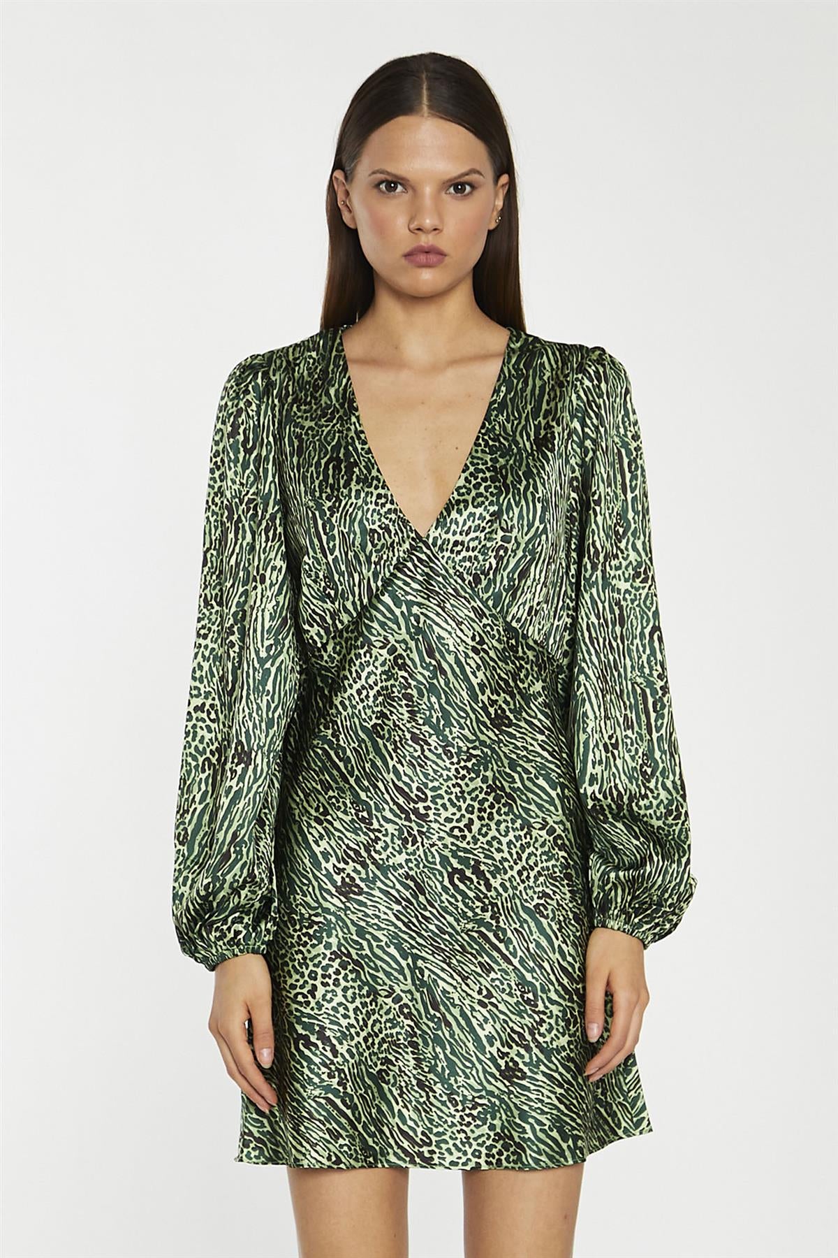 Glamorous Women's Green-Black Animal V-Neck Puff-Sleeve Mini-Dress. Show off your playful side with this animal print mini dress. Featuring a V-neck, long puff sleeves, and bias cut for a flattering fit, this mini-length dress will be sure to grab attention. Make a bold statement and flaunt your best features!