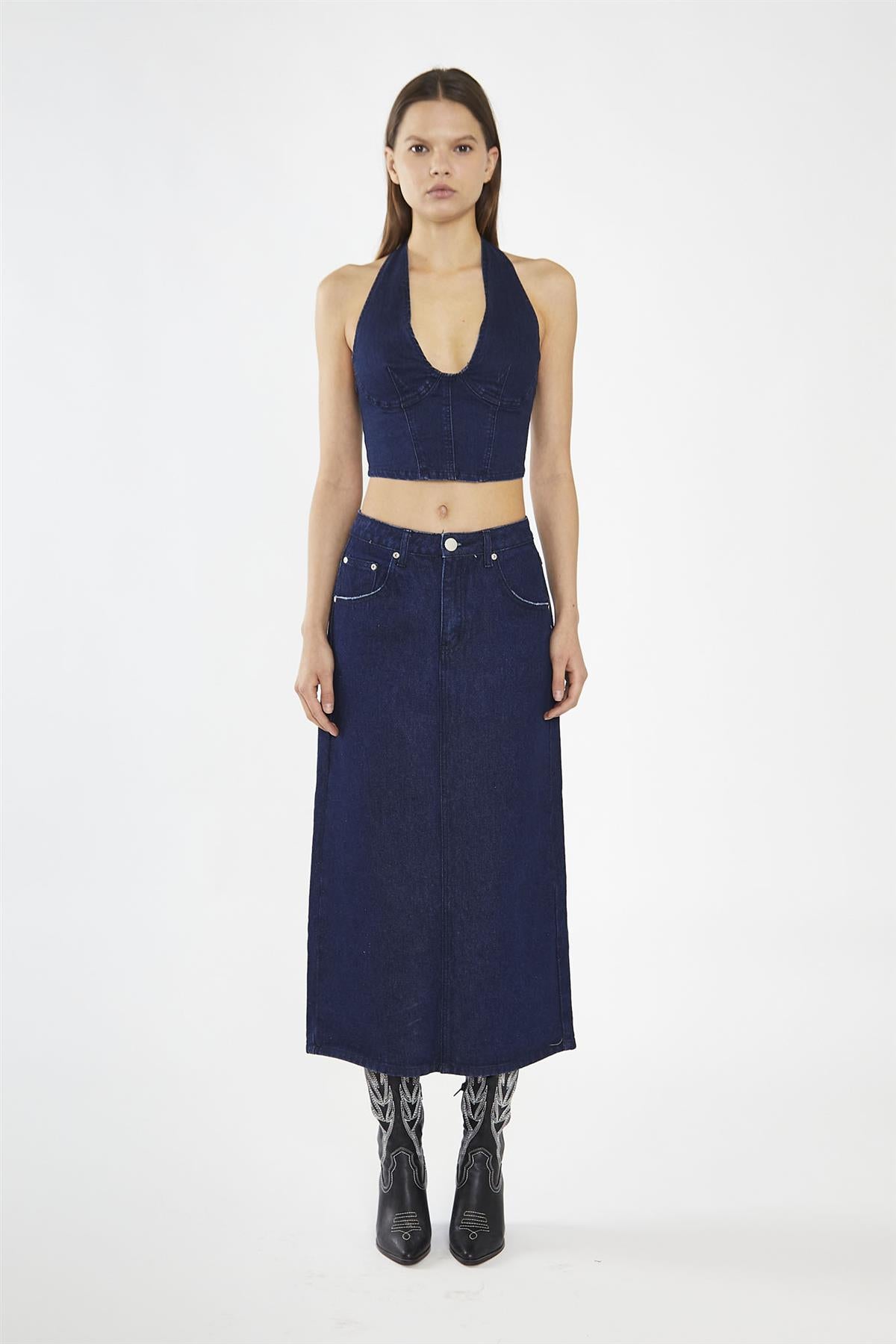 Glamorous Women's Indigo-Blue Front Split Denim Maxi-Skirt. Add a pop of colour to any look with this versatile denim midi skirt! In a stylish indigo hue, this denim skirt pairs perfectly with crop top and trainers for an effortlessly chic look. Outfitted with pockets and a comfy waistband, this skirt lets you look good and feel great all day long.