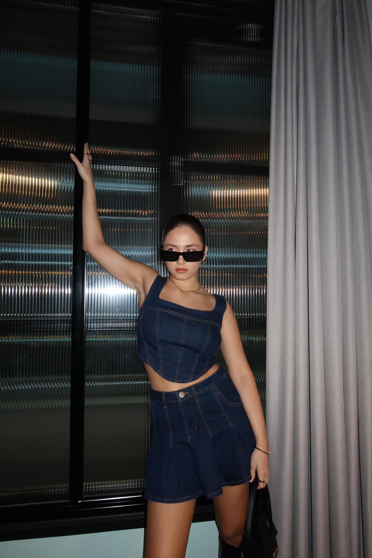 Glamorous Care Women's Indigo Wash Lace-Up Back Corset Top. Look chic and stylish in this Lace-Up Back Corset Top! The corset structure and lace-up back give it an edgy look, while the contrast stitch details and recycled fabric make it a sustainable fashion choice. To complete your look, pair it with the matching skirt for a statement-making set.