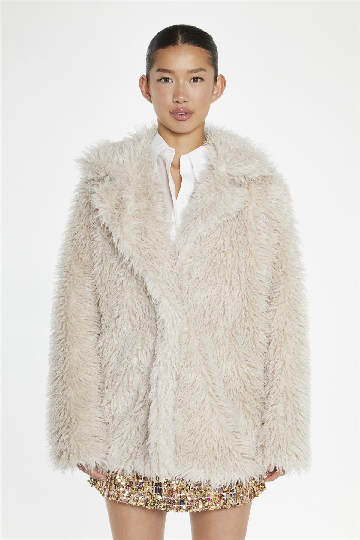 Glamorous Women's Light-Stone Faux Fur -Coat. Cozy up in our Light-Stone Faux Fur Coat and get ready to stay warm and stylish all season long. This plush, short-length coat features a luxurious faux fur exterior that's soft to the touch and sure to keep you toasty. The lapel collar adds a touch of classic elegance, while the versatile length allows you to layer it over everything from dresses to jeans. Slip it on over your favourite outfit for an instant boost of warmth and style, or use it to elevate a casual look. Crafted with attention to detail, this coat is a must-have addition to your cold-weather wardrobe, blending fashion and function seamlessly.
