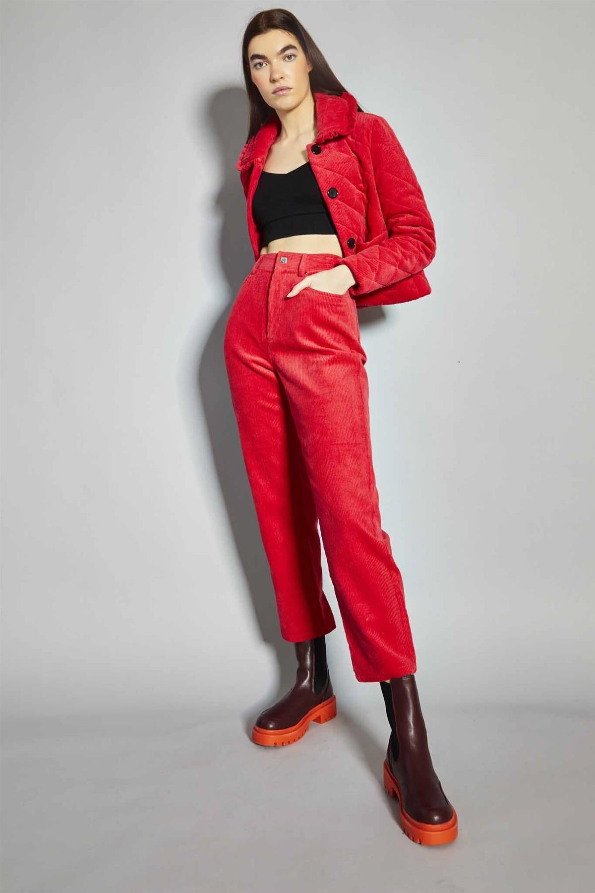 Glamorous Women's Lollipop-Red Corduroy Collared Padded-Jacket. Brighten up your outerwear collection with the Lollipop-Red Corduroy Collared Padded Jacket. This eye-catching piece combines comfort and style in a way that's sure to turn heads. The vibrant red corduroy fabric adds a playful touch to your look, while the padded design keeps you cozy on chilly days. The statement collar isn't just for show - it provides extra warmth around your neck and gives the jacket a classic, timeless feel. Layer it over a simple tee and jeans for a casual weekend look, or pair it with a sweater dress and boots for a more put-together outfit. The jacket's unique texture and bold colour make it a standout piece that works well with neutral tones or complementary bright hues. It's perfect for those days when you want to add a splash of personality to your ensemble. This Lollipop-Red Corduroy Collared Padded Jacket isn't just clothing - it's a mood lifter that'll have you feeling cheerful and confident, no matter the weather.