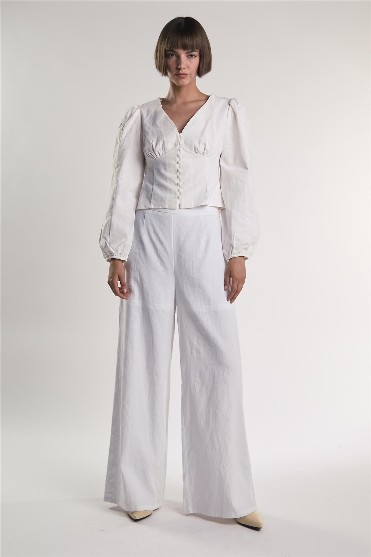 Glamorous Off-White Linen Long Sleeve, Button Front, V-Neck Blouse. This top is perfect for your wardrobe this season! Featuring a plunging V-neck and button front detail and long puff sleeves, we love this piece here at