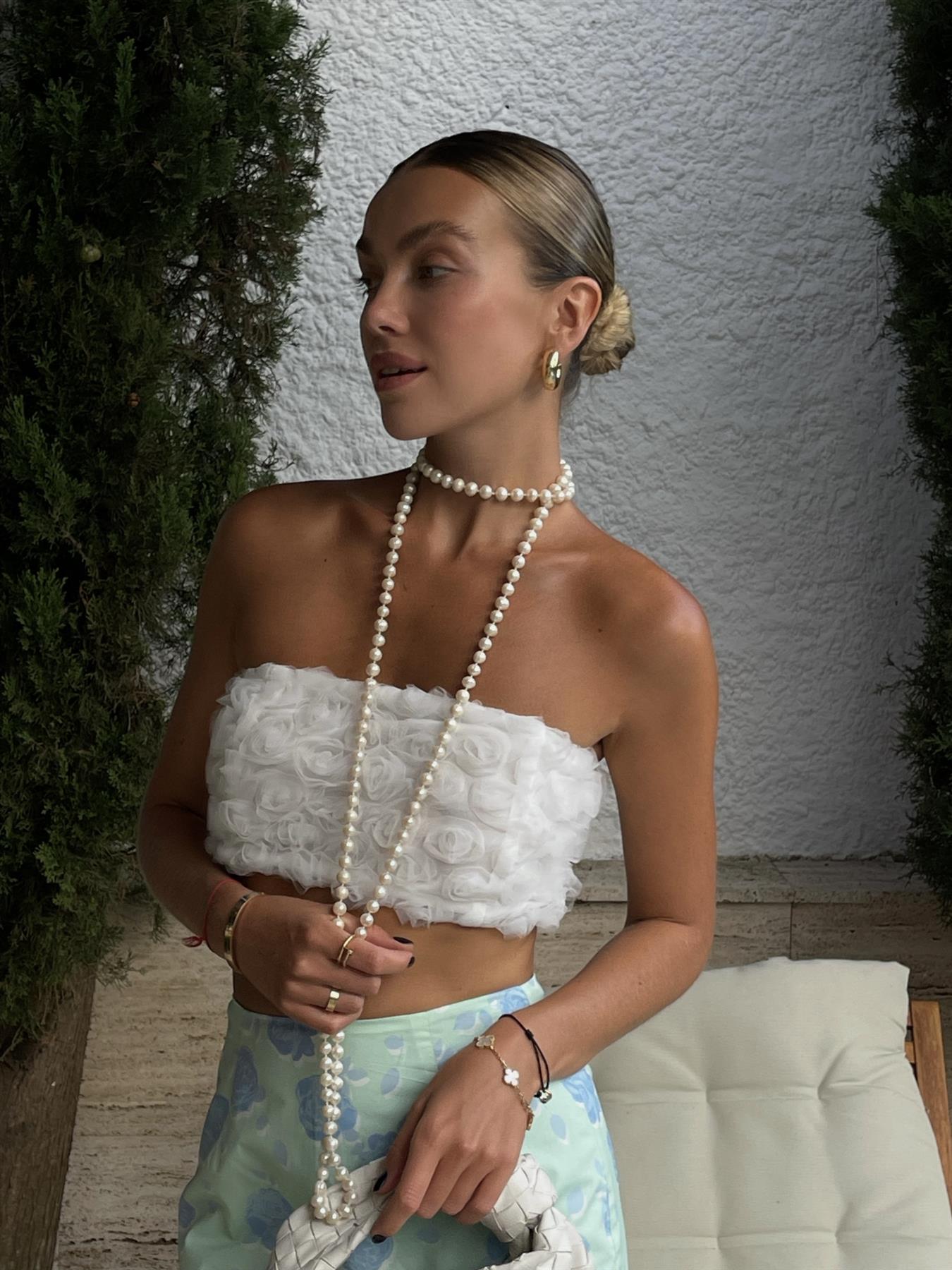 Collective the Label Women's Mia 3D Rose Bandeau-Top -White. Transform your wardrobe into a work of art with the Mia 3D Rose Bandeau-Top in white. Crafted with 3D floral tulle fabric and a strapless bandeau shape, this top offers a perfect blend of fashion and comfort. Designed with a fully lined interior and shirred back panel, this top provides a flawless fit for any event. Elevate your style with this essential addition to your collection.