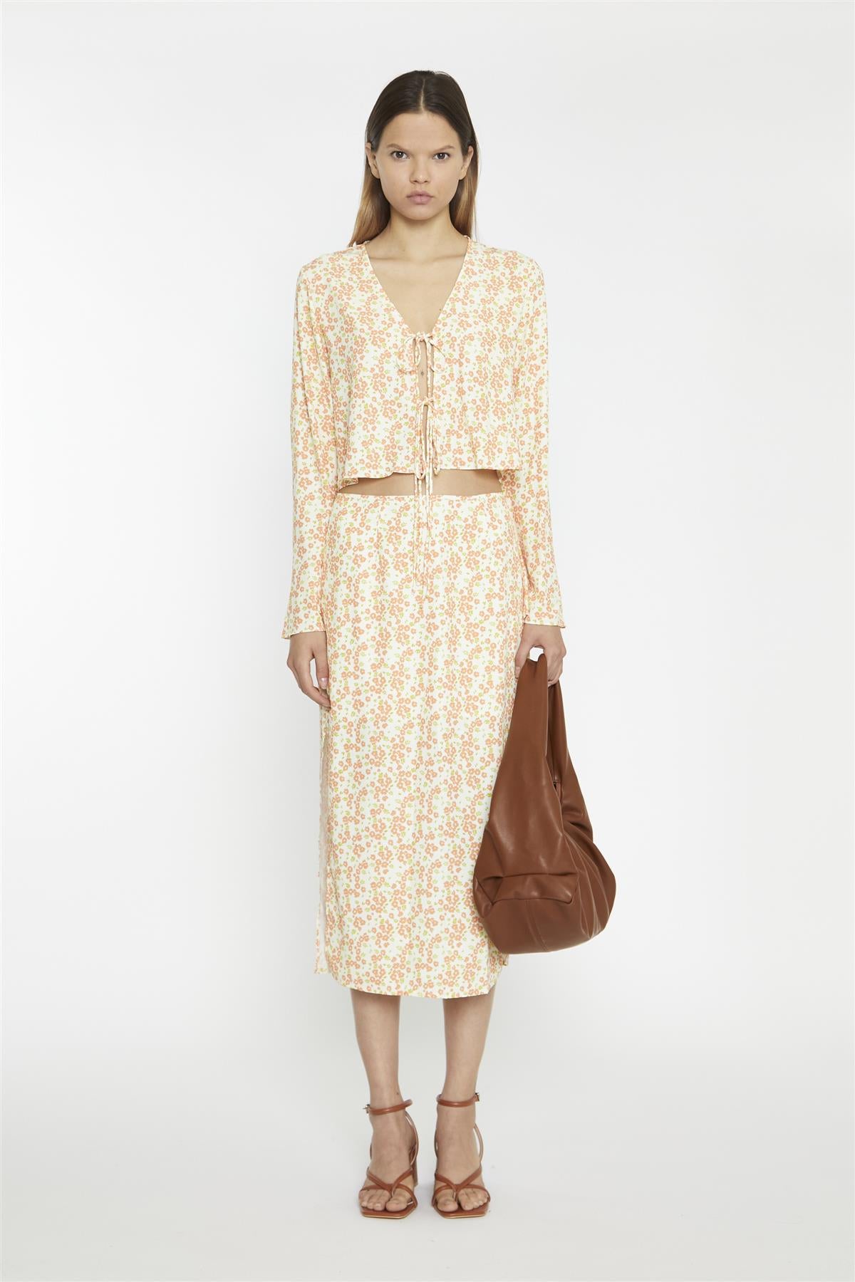 Glamorous Women's Muskmelon Multi Ditsy V-neck Tie-Front Crop-Top. This charming crop top is a burst of summer joy. The playful ditsy floral print dances across the fabric, bringing a touch of nature's beauty to your wardrobe. Its V-neck design adds a flattering touch, while the tie-front detail allows you to adjust the fit to your liking. The long sleeves offer versatility, making this top perfect for those cooler summer evenings or as a transitional piece into autumn. It's the kind of top that instantly lifts your mood and brightens your day. The cropped length hits just right, perfect for pairing with high-waisted bottoms. For a coordinated look that's sure to turn heads, team it with the matching skirt. Alternatively, mix it up with your favourite jeans or shorts for a more casual vibe. This top is more than just clothing - it's a little piece of sunshine you can wear, bringing a touch of floral cheer to any outfit. It's the perfect choice for picnics in the park, casual brunches, or any occasion where you want to feel effortlessly pretty.