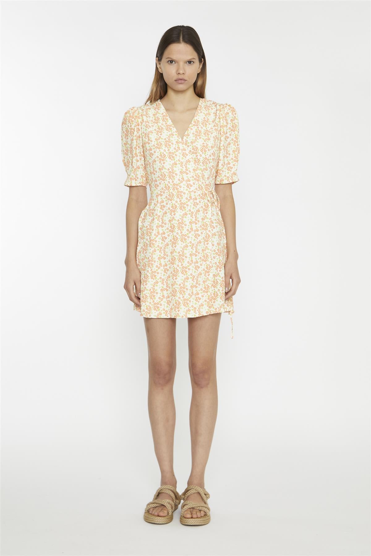 Glamorous Women's Muskmelon-Multi-Ditsy Wrap Mini-dress. Add a fresh and playful vibe to your wardrobe with this muskmelon multi-ditsy wrap mini dress. The wrap design flatters your figure by cinching at the waist, while the V-neckline creates a soft, feminine shape that’s easy to accessorize. Elbow-length statement sleeves bring a touch of flair, balancing the shorter hemline with just the right amount of coverage. The floral print adds a cheerful and lively feel, making this dress perfect for everything from casual outings to special occasions. Pair it with sandals and a woven bag for a relaxed daytime look, or dress it up with heels and delicate jewellery for an evening event. The lightweight fabric ensures you stay comfortable while looking effortlessly stylish. This dress is all about combining charm and versatility, giving you a piece that’s as fun to wear as it is easy to style.