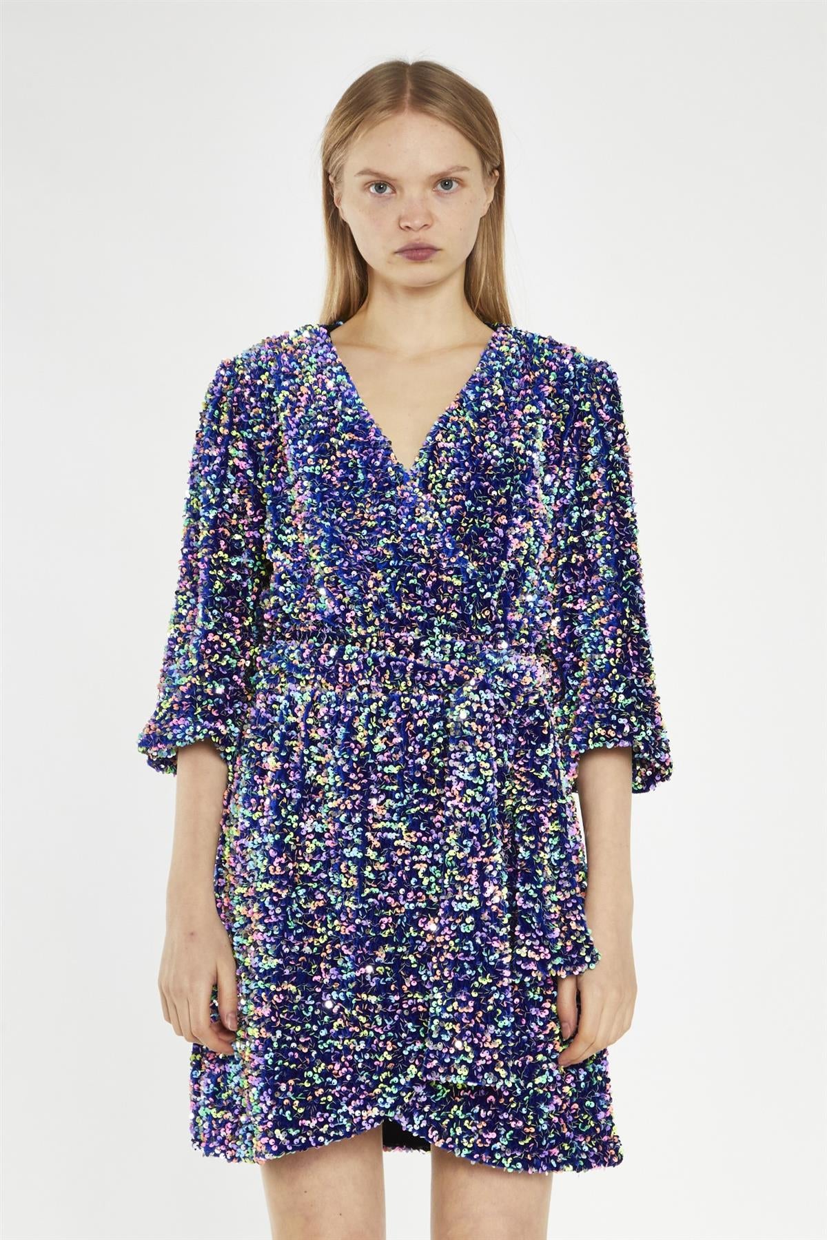 Glamorous Women's Navy Multi-Sequin Wrap Mini-Dress. Dazzle in our Navy Multi-Sequin Wrap Mini-Dress. This eye-catching piece features a captivating sequin velvet fabric that shimmers and shines, turning heads wherever you go. The wrap design creates a flattering, figure-hugging silhouette, while the puff sleeves add a touch of drama. The mini length keeps things flirty and fun, perfect for a night out on the town. The fully lined construction ensures a smooth, comfortable fit, so you can dance the night away with confidence. Pair this statement dress with your favourite heels and accessories for a night out, or dress it down with ankle boots for a more casual vibe. Get ready to feel fabulous and make a lasting impression.