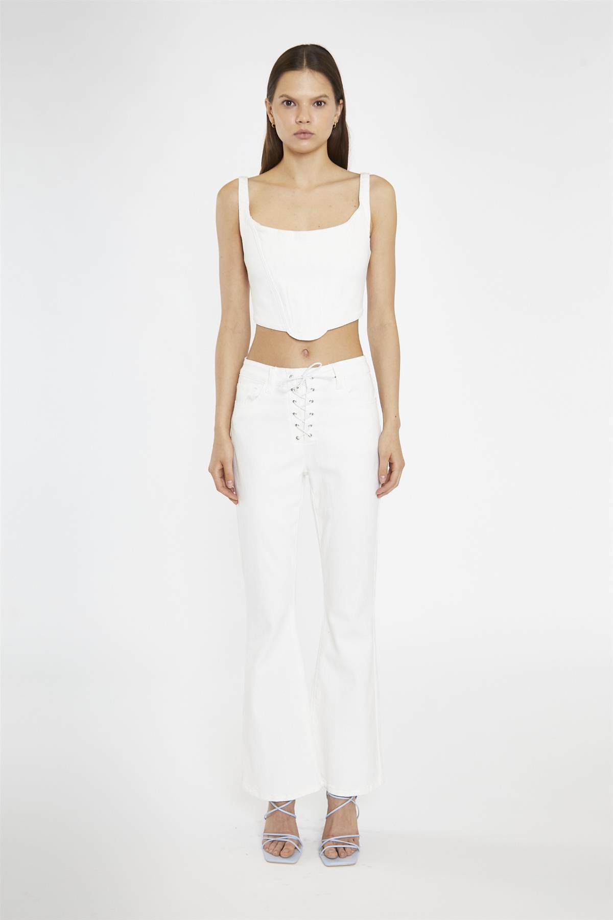 Glamorous Women's Off-White Lace-up Low-Waisted-Jeans. Elevate your denim game with our Off-White Lace-up Low-Waisted Jeans. Made from premium white denim, these jeans feature a flattering low-waisted fit with a flared leg for a stylish and comfortable look. The lace-up front fastening adds a touch of edginess to these must-have jeans. Upgrade your wardrobe today!
