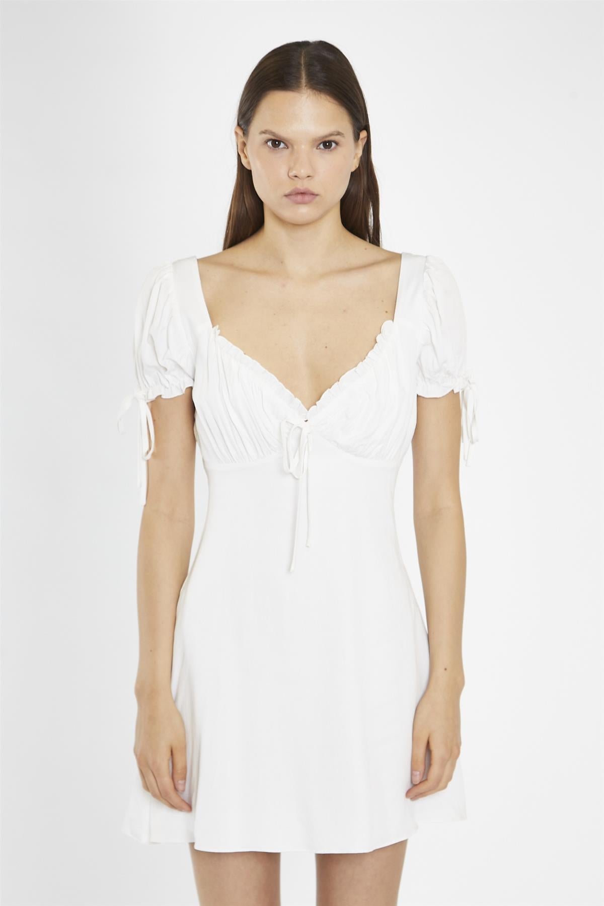 Glamorous Women's Off-White Milkmaid Mini-Dress. Elevate your style with our Off-White Milkmaid Mini-Dress! Featuring a tie front bust and puff sleeves, this mini dress offers a tailored fit and mini length for a chic look. Perfect for any occasion, feel confident and stylish in this must-have addition to your wardrobe.