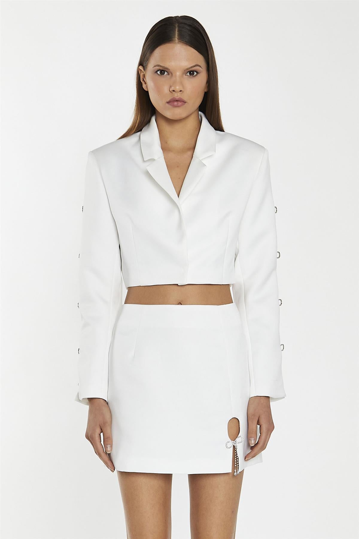 Glamorous Women's Off-White Satin Diamante Bow Crop-Blazer. This crop-blazer combines luxury and style with a satin fabric and a dazzling diamante bow detailing. Plus, you can style it with a matching skirt for an extra dose of glam.