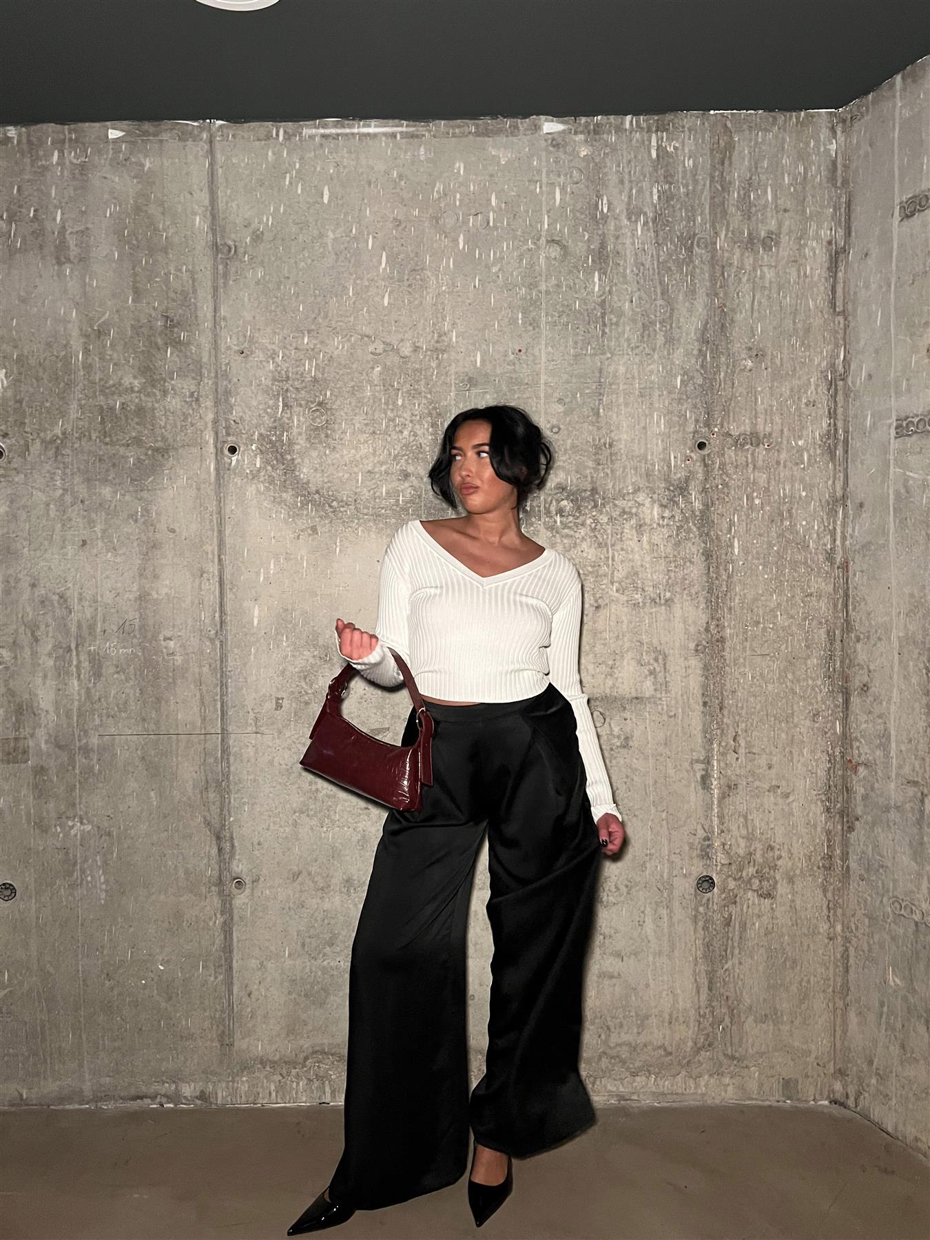 Glamorous Women's Off-White V-Neck Long-Sleeve Top. Keep your style effortlessly chic with our Off-White V Neck Long Sleeve Top. Featuring a flattering V-neckline, this top adds a subtle touch of elegance while keeping things simple and versatile. The long sleeves provide a cozy feel, perfect for layering or wearing on its own during cooler days. With its ribbed texture, this top offers a bit of added detail, making it more than just a basic. Pair it with high-waisted jeans for a relaxed, everyday outfit, or tuck it into a sleek skirt for a more polished look. This top is designed to be your go-to for casual comfort with a touch of style.