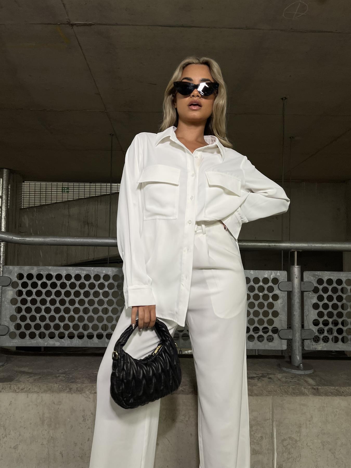 Glamorous Studio Women's Off White Wide leg High Waisted-Trousers. Get ready to strut your style in these off white wide leg trousers! Made for the bold and fashion-forward, these trousers provide a comfortable and stylish fit with their loose, flowy legs. Perfect for any occasion, these trousers will have heads turning and compliments flowing. Style with the matching top for a relaxed trendy look!