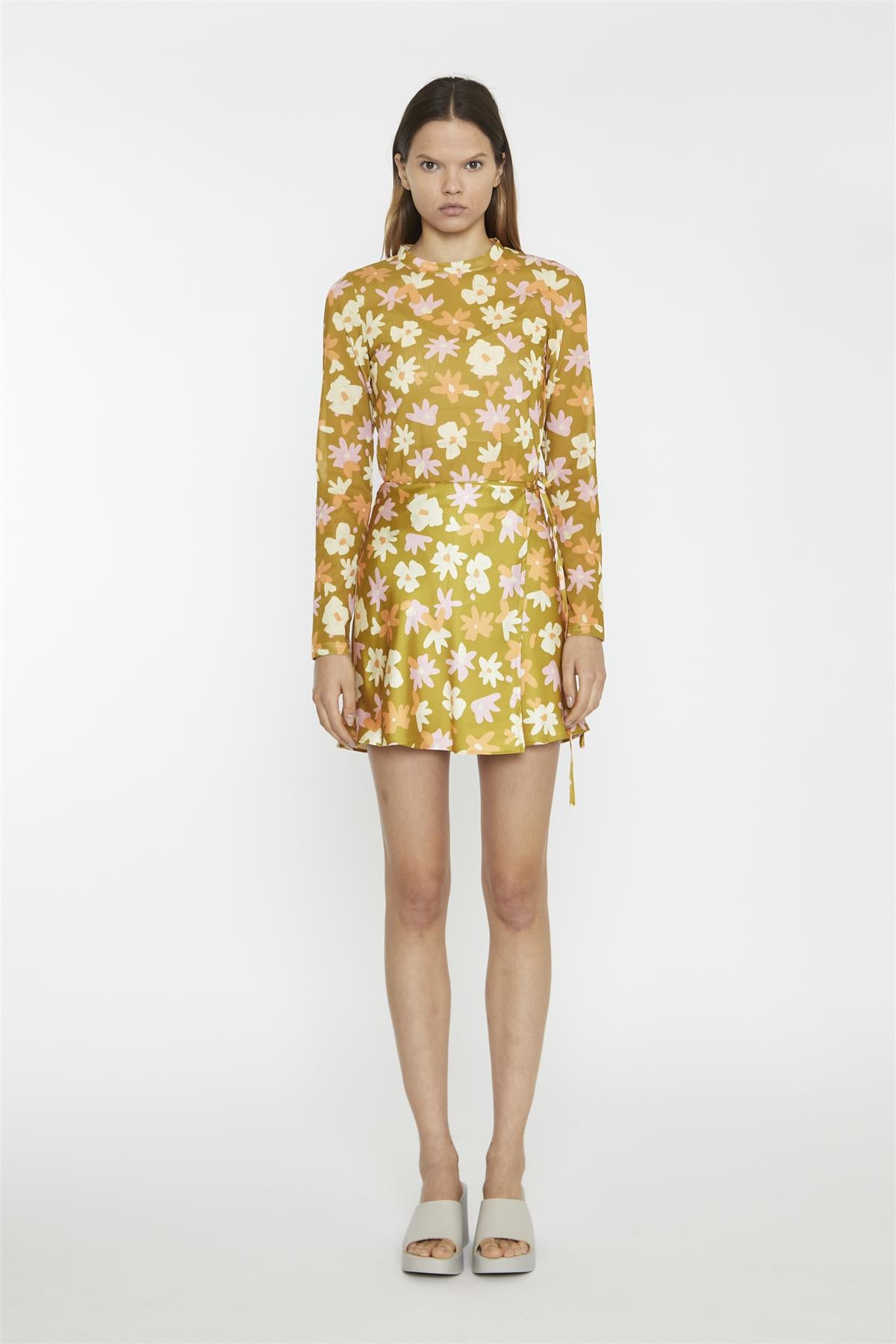 Glamorous Women's Olive Multi Flower Wrap Mini-Skirt. Bloom into style with this playful mini skirt that's bursting with floral charm. The wrap design hugs your curves in all the right places, creating a flattering silhouette that's both comfortable and chic. It's the perfect piece for those days when you want to feel feminine and carefree. The vibrant floral print adds a pop of nature-inspired beauty to your outfit, making it ideal for sunny picnics, casual brunches, or evening strolls. The mini length shows off your legs while the wrap style allows for easy movement. You'll love how versatile this skirt is - pair it with the matching top for a coordinated look that screams summer fun, or mix it up with a solid tee for a more laid-back vibe. The lightweight fabric ensures you stay cool and breezy, even on the warmest days. This skirt is more than just a piece of clothing; it's a mood-lifter that brings a touch of garden-fresh beauty to your wardrobe.
