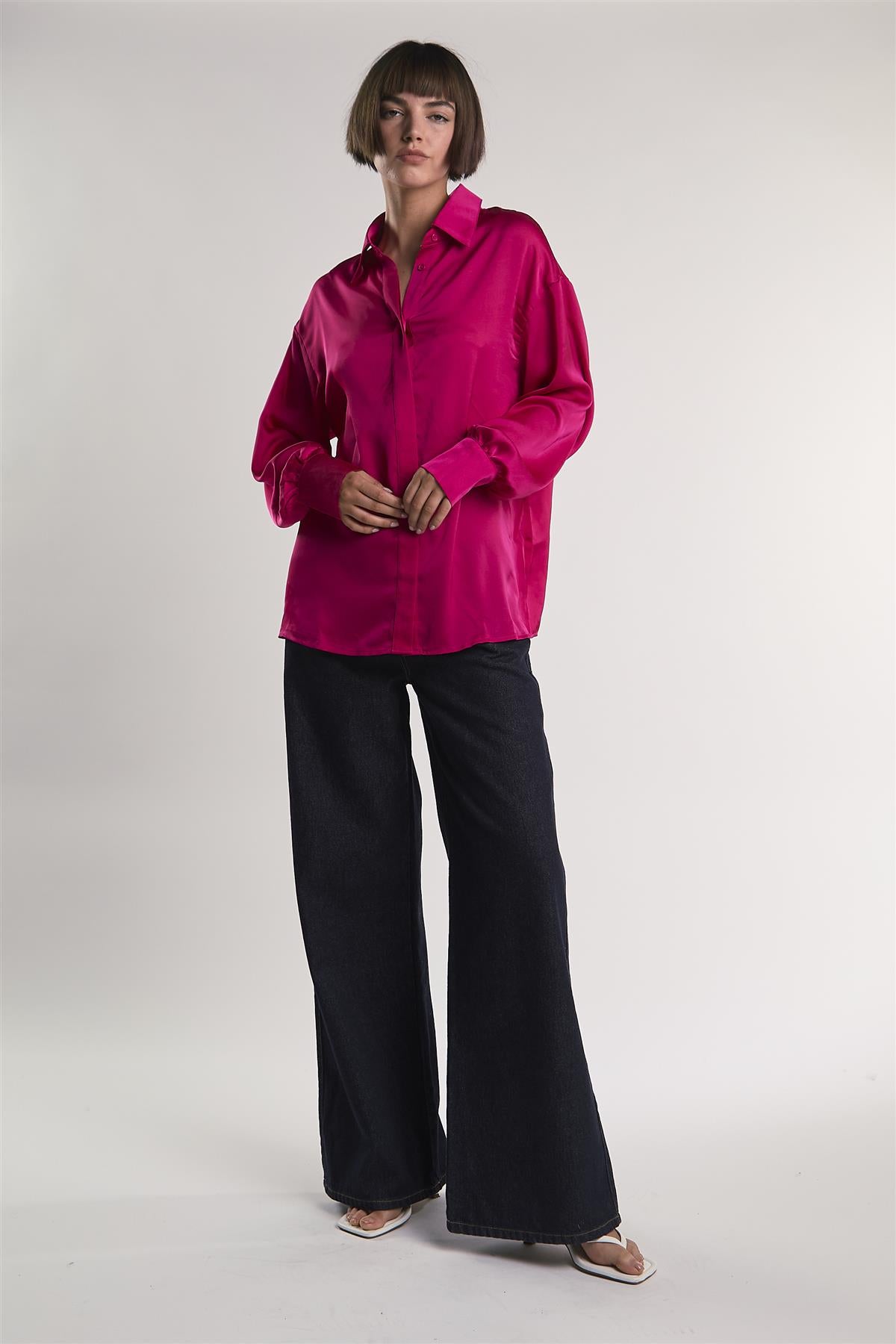 Glamorous Women's Raspberry-Sateen Long-Sleeve 0-Shirt. This raspberry sateen long-sleeve shirt has an easy charm that works just as well dressed up or worn casually. The soft sheen of the fabric gives it a slightly polished look without feeling stiff, and the button front lets you play around with how buttoned-up you want to be. A spread collar keeps things classic but relaxed, and the long sleeves are just right for rolling up or leaving down, depending on your day. It’s the kind of piece that can hang loose over jeans or be half-tucked into tailored pants for something a little more styled. Add simple jewelry or a textured bag to keep things feeling balanced and laid-back.