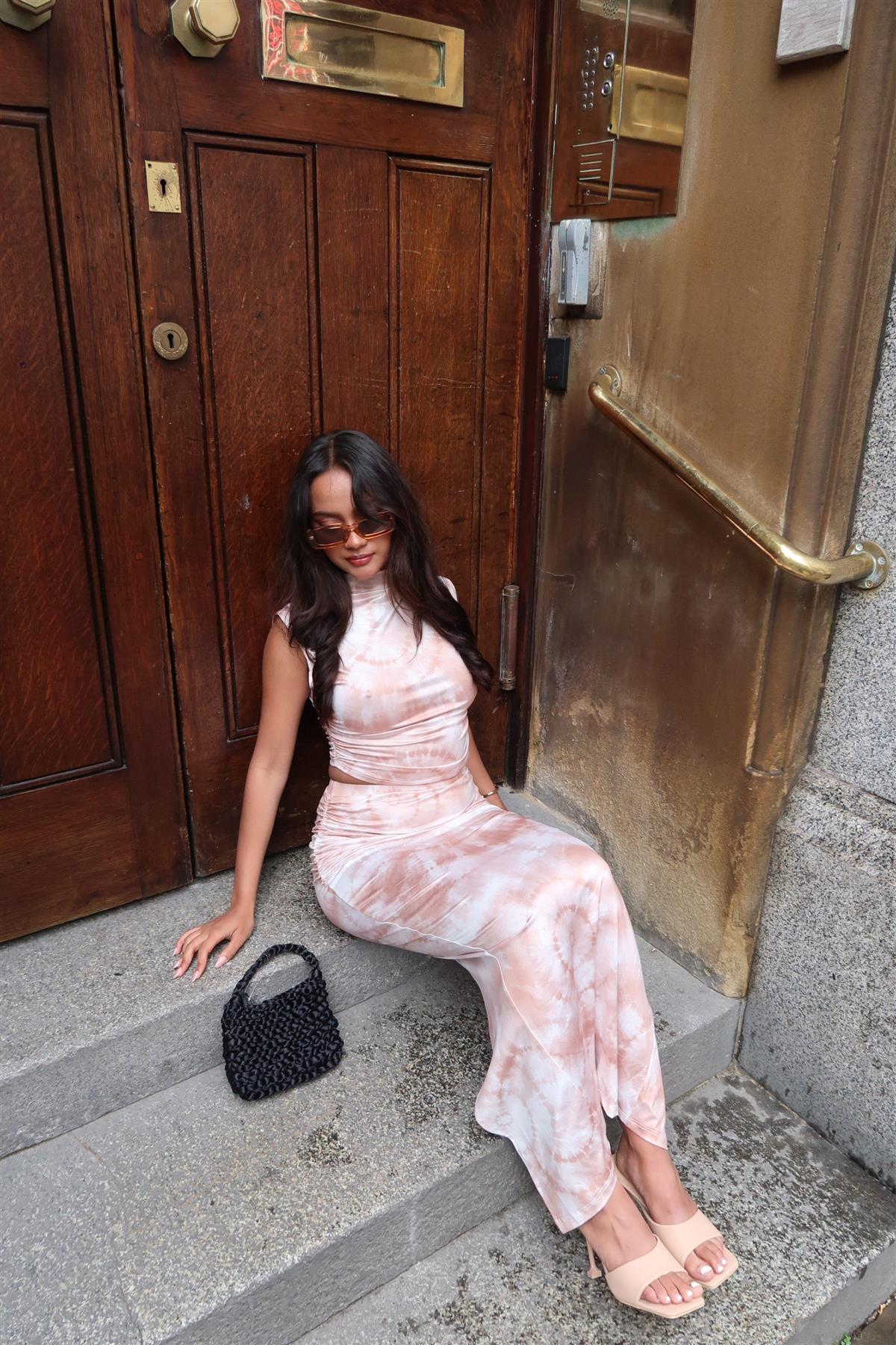 Narrated Women's Sepia Tie Dye Sleeveless Crop-Vest Top. This sepia tie-dye sleeveless crop-vest top is a fun and stylish addition to your wardrobe, perfect for creating effortless outfits. The roll neck gives it a modern edge, while the cropped length adds a playful touch that pairs well with high-waisted bottoms. The soft tie-dye pattern in warm sepia tones makes it easy to mix and match with neutral or bold pieces. For a coordinated look, pair it with the matching skirt to create a striking set that’s perfect for casual outings or relaxed evenings. Lightweight and versatile, this top is great for layering or wearing on its own, making it a go-to piece for days when you want to keep things simple but chic