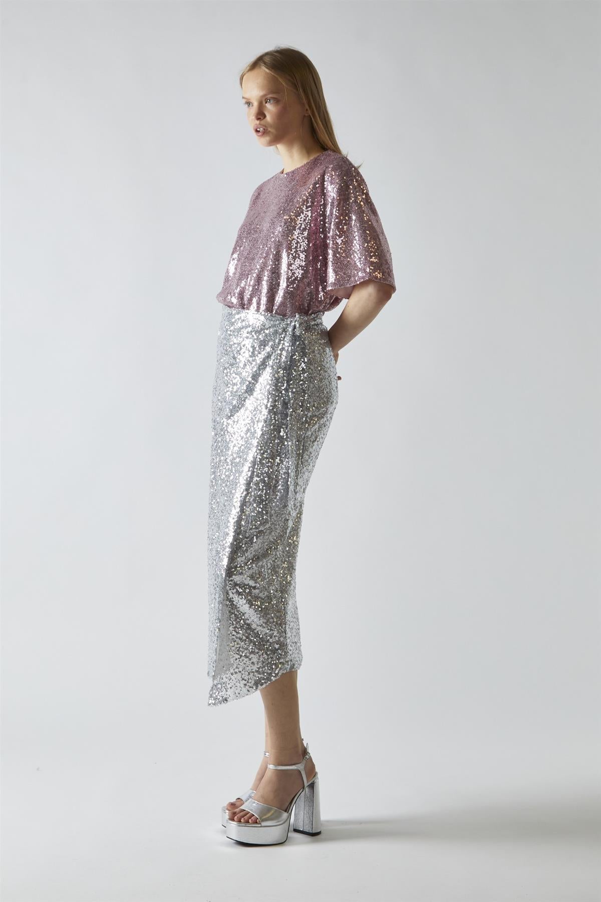 Glamorous Women's Silver-Sequin Wrap Midi-Skirt. Add some sparkle to your wardrobe with this dazzling silver sequin midi-skirt. It's the perfect piece for those who love to shine, literally and figuratively. The straight silhouette creates a sleek, flattering line that works for various body types, while the midi length keeps things classy and versatile. A standout feature is the tie knot detail, adding a touch of modern flair and allowing you to adjust the fit to your liking. The leg split brings a hint of allure and makes movement a breeze - no more shuffling in tight skirts! This skirt is a true party starter, catching and reflecting light with every step you take. It's surprisingly versatile too - pair it with a simple black tee for a cool contrast, or go all out with a matching sequin top for those extra special occasions. The beauty of this skirt is its ability to make you feel fabulous without trying too hard. It's comfortable enough for dancing the night away, yet glamorous enough to make you feel like the star of the show. This silver sequin midi-skirt isn't just clothing; it's a mood booster that brings a bit of celebration to any day you choose to wear it.