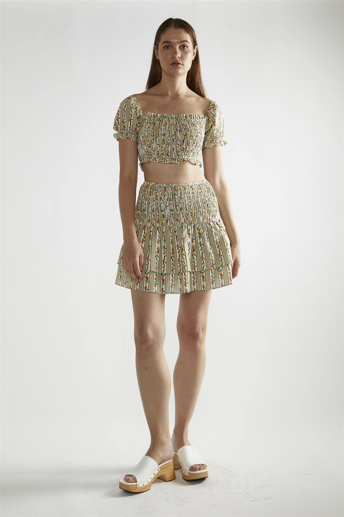 Glamorous Women's Stripe Ditsy Linen Scoop-Neck Crop-Top. Our Stripe Ditsy Linen Scoop-Neck Crop-Top is a delightful blend of comfort and style, perfect for warm days. The lightweight linen fabric keeps you cool, while the playful stripe and ditsy print add a fun touch to your outfit. The scoop neck design flatters your neckline and provides a relaxed fit, making it easy to wear for any occasion. With short sleeves, this crop-top is ideal for layering or wearing on its own. Pair it with the matching skirt for a coordinated look that’s effortlessly chic, or mix and match with high-waisted jeans or shorts for a more casual vibe. This versatile top is perfect for everything from brunch with friends to beach outings, ensuring you feel stylish and comfortable all day long. With its easy-going design and cheerful print, this crop-top is sure to become a favourite in your summer wardrobe.