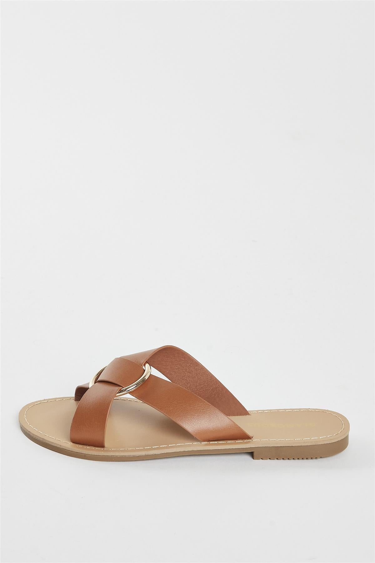 Glamorous Women's Tan PU Flat Sandals -Flat Sandals. Jump into summer with these stylish Tan Flat Sandals! With a flat sole and convenient slip on style, you can enjoy effortless, all-day comfort. The criss-cross design and open toe provide a trendy look that's sure to keep heads turning!