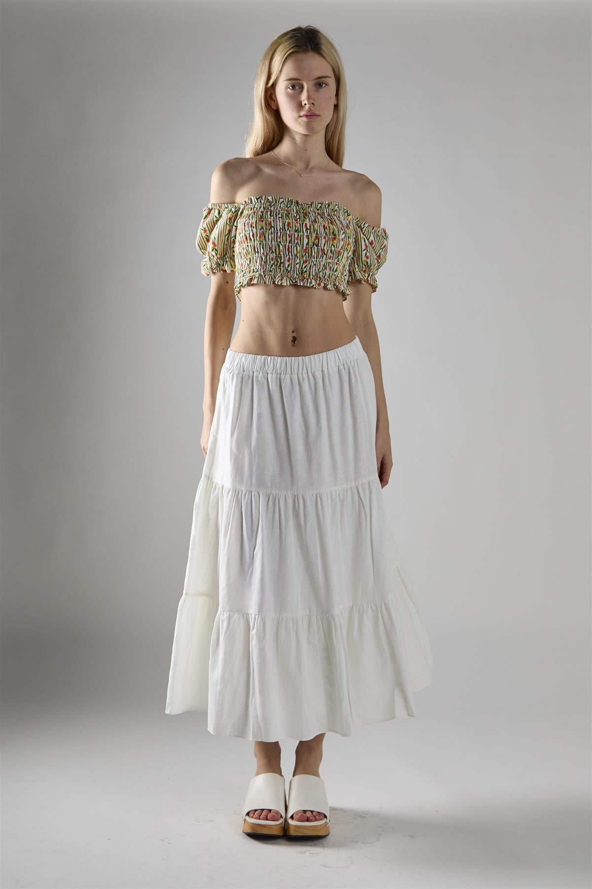 Glamorous Women's White Chiffon Tiered Midaxi-Skirt. This chiffon-tiered midaxi-skirt is a dream come true for those who love to float through their day with effortless style. The light, airy fabric dances with every step, creating a mesmerizing effect that's sure to catch admiring glances. Its tiered design adds volume and movement, making it perfect for twirling or simply swishing as you walk. The pleated fabric brings texture and depth, elevating this skirt from simple to stunning. Don't worry about comfort - the elasticated waistband ensures a snug, yet forgiving fit that moves with you throughout the day. The midaxi length hits that sweet spot between midi and maxi, offering versatility for various occasions. Dress it up with a silky camisole and heels for a romantic dinner date, or keep it casual with a tucked-in tee and sneakers for a chic brunch look. This skirt is more than just an item of clothing; it's a mood-lifter, a confidence-booster, and a wardrobe staple that you'll reach for time and time again.