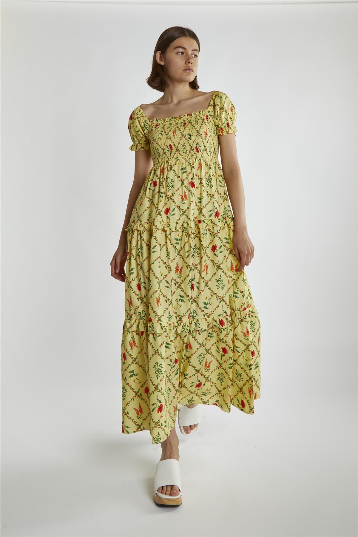 Glamorous Women's Yellow Floral Lattice Scoop Neck Maxi-Dress . Our Yellow Floral Lattice Scoop Neck Maxi-Dress is a bright and cheerful addition to your summer wardrobe. The vibrant yellow fabric features a lovely floral lattice print that instantly brings a touch of sunshine to any occasion. With a flattering scoop neck, this dress enhances your neckline while providing a comfortable fit. The short statement sleeves add a stylish flair, making it perfect for warm-weather outings. The frill layered detail along the skirt creates beautiful movement as you walk, adding a playful element to your look. This maxi-dress is perfect for garden parties, beach days, or casual brunches with friends. Pair it with simple sandals for a laid-back vibe or dress it up with wedges and bold accessories for a night out. The lightweight fabric ensures you stay cool and comfortable, making it an ideal choice for those sunny days when you want to feel both stylish and relaxed. This dress is sure to become a favourite in your collection, ready to brighten up any event.
